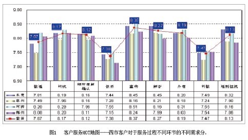 客戶(hù)服務(wù)MOT地圖(圖1)——該模塊通過(guò)對(duì)10086熱線服務(wù)過(guò)程的全景式展示,直觀表現(xiàn)不同地區(qū)、不同品牌客戶(hù)在10086熱線服務(wù)不同環(huán)節(jié)上的核心需求,話務(wù)員通過(guò)本模塊,可以迅速把握10086熱線服務(wù)的要點(diǎn);