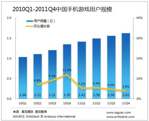 CTI論壇(ctiforum)2月27消息(記者 潘婷婷): 根據(jù)EnfoDesk易觀智庫產(chǎn)業(yè)數(shù)據(jù)庫最新發(fā)布的《2011年第4季度中國手機(jī)游戲市場季度監(jiān)測》數(shù)據(jù)顯示,中國手機(jī)游戲用戶規(guī)模穩(wěn)步增長,截止2011年第4季度達(dá)1.62億,環(huán)比增長3.83%。CTI論壇報(bào)道