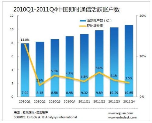 CTI論壇(ctiforum)3月23日消息(記者 潘婷婷): 根據(jù)EnfoDesk易觀(guān)智庫(kù)發(fā)布的《2011年第4季度中國(guó)即時(shí)通信市場(chǎng)季度監(jiān)測(cè)》數(shù)據(jù)顯示,截止到2011年底,中國(guó)即時(shí)通信活躍賬戶(hù)數(shù)達(dá)到10.65億,環(huán)比增長(zhǎng)3.5%,同比增長(zhǎng)18.62%。