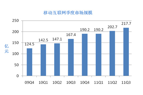 上圖是易觀國際發(fā)布的移動(dòng)互聯(lián)網(wǎng)的相關(guān)數(shù)據(jù),數(shù)據(jù)截止到2011年第三季度,該圖顯示,2009年全球經(jīng)濟(jì)復(fù)蘇之后,移動(dòng)互聯(lián)網(wǎng)業(yè)務(wù)收入一直保持著良好的增長狀態(tài),最新數(shù)據(jù)表明,2011年移動(dòng)互聯(lián)網(wǎng)的整體市場規(guī)模已達(dá)到851億,遠(yuǎn)超過2010年的637億,增長率將近33.6%,在移動(dòng)互聯(lián)網(wǎng)業(yè)務(wù)子領(lǐng)域中,表現(xiàn)最突出的是移動(dòng)電子商務(wù),與2009年相比較,移動(dòng)電子商務(wù)所占比例由3%直線增長到11%。但是在手機(jī)閱讀和手機(jī)游戲方面則表現(xiàn)平平,有較大的增長空間。預(yù)計(jì)2012年3G用戶規(guī)模將增長到6億,將會超過互聯(lián)網(wǎng)用戶數(shù)量,智能機(jī)以及移動(dòng)互聯(lián)網(wǎng)還會保持或者超過2011年的增長速率。