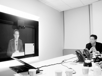 圖:Orange網(wǎng)絡解決方案業(yè)務部副總裁Nicolas Roy在巴黎演講,Orange中國區(qū)首席技術(shù)官劉昕(右)在主持北京視頻會議現(xiàn)場
