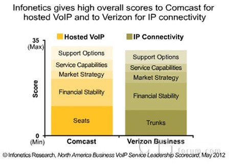 Infonetics Research公司VoIP 和IMS主要分析師Diane Myers 表示:“Comcast公司收購了New Global Telecom,前者在我們企業(yè)VoIP平衡記分卡中常年領(lǐng)先,今年這個(gè)收購?fù)苿?dòng)Comcast公司在Infonetics的托管業(yè)務(wù)VoIP領(lǐng)導(dǎo)力計(jì)分卡中位于第一的位置,連續(xù)四年的排名中,Verizon Business公司在IP 互聯(lián)領(lǐng)導(dǎo)力平衡計(jì)分卡中處于第一的位置,其次是AT&T公司”