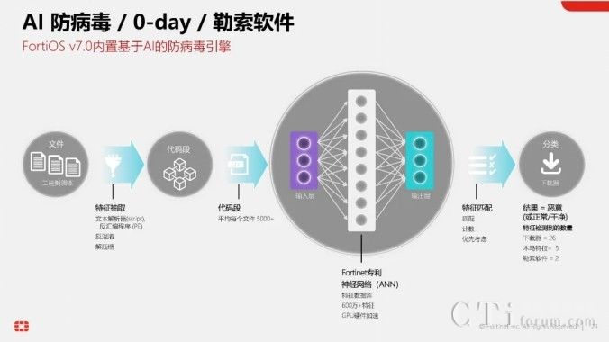目前,AI技術已深度融入Fortinet的數十種產品與方案中。在最新版的統(tǒng)一網絡安全操作系統(tǒng)FortiOS 7.6中,就已經內置了由FortiGuard AI實驗室研發(fā)的基于AI的防病毒引擎。該引擎運用神經網絡技術,學習并區(qū)分海量病毒文件與正常文件,通過分類打分的方式,實現(xiàn)對未知文件與病毒的精準判斷,無需依賴傳統(tǒng)的病毒特征庫。因此,F(xiàn)ortinet的FortiGate等產品在防病毒方面擁有雙引擎加持,既有傳統(tǒng)的基于病毒特征庫的防病毒引擎,又有基于AI的下一代防病毒引擎(Anti-virus NGAV),雙重保障,安全無憂。