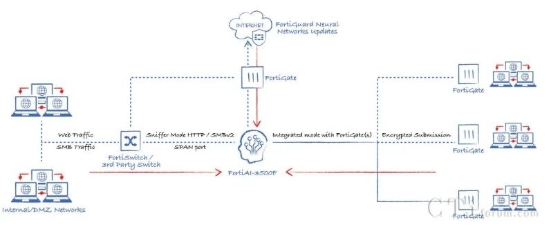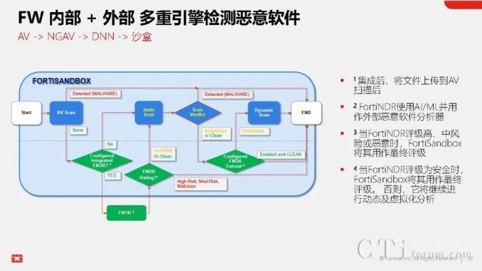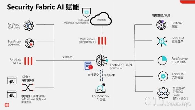 此外,AI技術還貫穿于Fortinet的多個產品與功能中,形成高效的工作流。以威脅檢測與響應為例,當FortiGate的雙引擎也無法確定某個文件的合法性時,它可以將該文件提交給FortiNDR進行深度分析,利用云端深度神經網絡AI進行0 Day攻擊、勒索軟件等深層次分析。若仍無法確定,還可進一步提交給FortiSandbox,在虛擬機環(huán)境中進行模擬操作,進行更為深入的檢測。在這一系列流程與技術的支持下,F(xiàn)ortinet的威脅檢測與響應能力已達到業(yè)界頂尖水平,向滿分100分邁進。