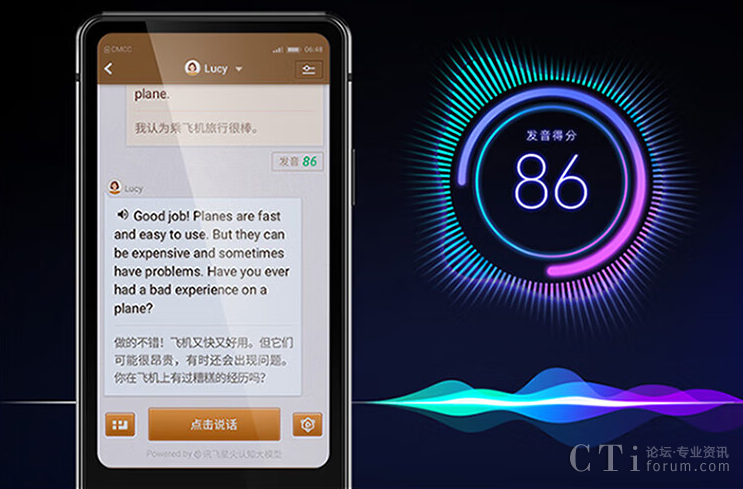 AI教練可以隨時隨地和用戶一對一地聊天,并會將聊天內(nèi)容用中英文對照的方式顯示在屏幕上,同時還會對用戶的口語發(fā)音進行智能打分。