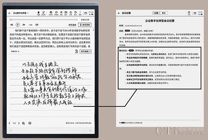 其中會議紀(jì)要功能,可將科大訊飛智能辦公本的語音實時轉(zhuǎn)寫功能與墨水屏紙感書寫相結(jié)合,并且可以對會議記錄內(nèi)容形成一份精簡的會議紀(jì)要,有助于快速回溯會議內(nèi)容。