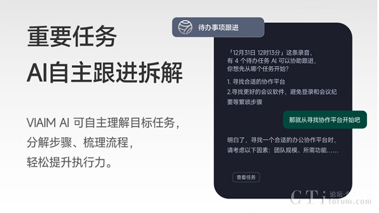借助VIAIM AI智慧大腦,可一鍵提取會議摘要,海量會議內(nèi)容瞬間搞定,無需費時手動梳理;待辦事項自動匯總,并可根據(jù)需求生成具體待辦子任務(wù),在執(zhí)行的過程中,科大訊飛降噪會議耳機Nano+會自主理解并分解目標(biāo)任務(wù)、理清流程,輕松提升執(zhí)行力。