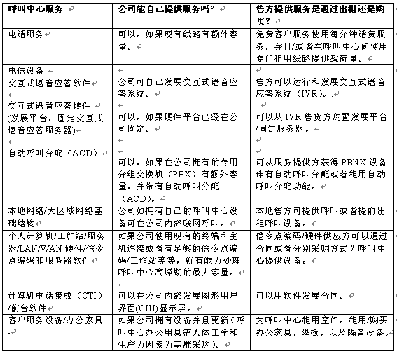 。。一旦決定從事呼叫中心業(yè)務(wù),公司必須確定要從外部售貨方購(gòu)買的服務(wù)與設(shè)備的范圍。公司政策和經(jīng)營(yíng)法則會(huì)指示其應(yīng)遵循什么程序進(jìn)行這一過(guò)程。也可能會(huì)是一些合同,它們可以使公司能夠快速地完成這些步驟。