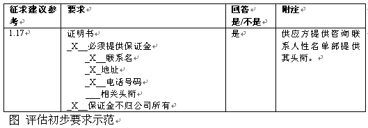 。。在評(píng)估的這一部分中通常不給予建議申請(qǐng)的"初步強(qiáng)制性要求"。但是,若不提供基本要求的信息,可能造成停止對(duì)某一特定建議評(píng)估。圖x中的示范工作表用來(lái)檢驗(yàn)供應(yīng)方對(duì)這些初步要求的回應(yīng)。