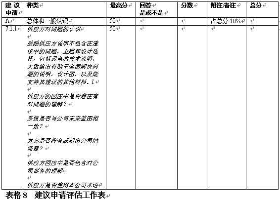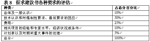 。。在決定了初步要求之后,評(píng)估小組應(yīng)具體地開展評(píng)估工作。具體評(píng)估的目標(biāo)是通過(guò)給建議書主要方面打分作出評(píng)估。可以在算出建議書各方面占總分?jǐn)?shù)的百分比,如表8中對(duì)各方面的總覽。一般在建議書內(nèi)向提供者給出這一信息。