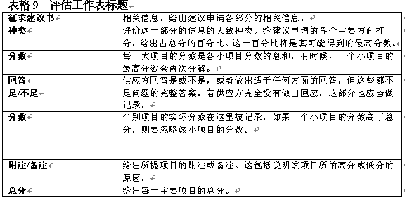 建議申請(qǐng)?jiān)u估工作表有助于資源選擇工作組客觀地對(duì)承包商建議進(jìn)行評(píng)價(jià)。這一過(guò)程包括在總分基礎(chǔ)上給各個(gè)方面評(píng)分。表格8舉出了一個(gè)具體的評(píng)分表表格9包含了對(duì)工作表標(biāo)題的解說(shuō)。