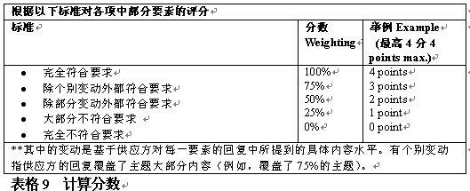 。。評(píng)分者應(yīng)該了解供應(yīng)方對(duì)所提建議申請(qǐng)的回復(fù),從各方面評(píng)估該建議符合每一評(píng)判標(biāo)準(zhǔn)的情況,相應(yīng)地給出分?jǐn)?shù)。根據(jù)每個(gè)標(biāo)準(zhǔn),應(yīng)在評(píng)判過(guò)程中分組給出最高分?jǐn)?shù)。表格9舉例說(shuō)明了如何對(duì)回復(fù)打分。.