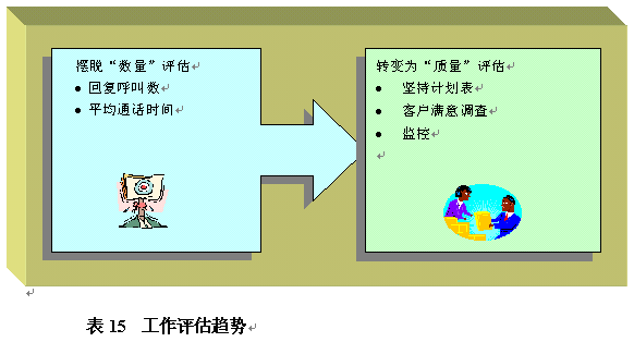 。。這些年呼叫中心工作評(píng)估經(jīng)歷了一些變化。最新趨勢是擺脫死板的"數(shù)量"評(píng)估,例如回復(fù)呼叫數(shù),通過客戶滿意度調(diào)查和監(jiān)控進(jìn)行數(shù)量評(píng)估以外的更全面的質(zhì)量評(píng)估。在表14中指出這種最新的工作評(píng)估趨勢的原因是,大量數(shù)量評(píng)估,例如回復(fù)呼叫數(shù),實(shí)際上已經(jīng)不能使員工在其基礎(chǔ)上進(jìn)行改善。例如,一個(gè)每小時(shí)接聽十個(gè)呼叫的員工并不比每小時(shí)僅接聽五個(gè)呼叫的員工效率更高。呼叫中心管理者評(píng)估員工工作更好的辦法是在這種數(shù)量評(píng)估中加入額外的質(zhì)量評(píng)估。