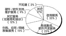 根據(jù)IT支出就可以推測購買過程及其重點。平均而言,在被調(diào)查者的CRM支出中,29%用在硬件上,16%用在軟件上,38%用在內(nèi)部服務(wù)上,16%用在外部服務(wù)上。圖2顯示了用在外部服務(wù)上的IT支出,其中包括: