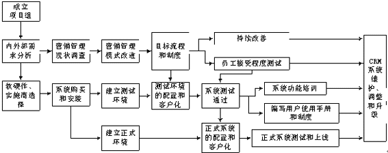 一個CRM系統(tǒng)的建設(shè)所經(jīng)過的歷程,可以用圖1所示。漢普管理咨詢(中國)有限公司的CRM系統(tǒng)的實施就是按照這個路線進行的,主要從管理的調(diào)整和信息系統(tǒng)的建設(shè)兩個方面著手。