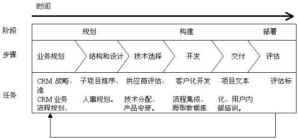 CRM規(guī)劃圖包括三個(gè)主要的項(xiàng)目開(kāi)發(fā)階段:規(guī)劃、構(gòu)建、部署;它還以“分布驟”為特色,包括許多固定的和可變的任務(wù),簡(jiǎn)單介紹如下: