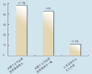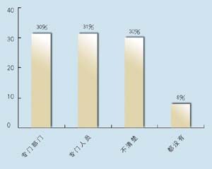 在問(wèn)到實(shí)施周期上,有9家表示希望在3個(gè)月內(nèi)完成,占到47.4%,有6家接受3~6個(gè)月的周期,超過(guò)6個(gè)月的周期已經(jīng)顯得太長(zhǎng)。在問(wèn)到CRM的實(shí)施效果上,有9家認(rèn)為對(duì)公司運(yùn)營(yíng)效率有很大提高,8家認(rèn)為作用一般,只有2家認(rèn)為沒有作用。表明基本上企業(yè)認(rèn)可CRM的作用。在問(wèn)到是否有專門人員負(fù)責(zé)CRM時(shí),有6家表示有專門部門,有6家有專門人員,合計(jì)占62%,說(shuō)明企業(yè)非常重視CRM的應(yīng)用。