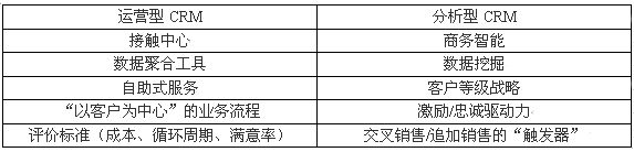 一般情況下CRM的可分為兩大類:即運(yùn)營(yíng)型CRM和分析型CRM。(有時(shí)把"協(xié)作型CRM"單獨(dú)作為一類)。多數(shù)情況之下運(yùn)營(yíng)型CRM引用的是產(chǎn)品,服務(wù)和一個(gè)企業(yè)實(shí)際能夠"照料"客戶的運(yùn)做能力。關(guān)系中心,數(shù)據(jù)集合系統(tǒng)及Web站點(diǎn)僅僅是一些例子。分析型CRM主要指用來推動(dòng)"以客戶為中心"的戰(zhàn)略和工具。商務(wù)智能系統(tǒng),數(shù)據(jù)挖掘工具及客戶層級(jí)戰(zhàn)略都可以算在這個(gè)范疇之內(nèi)。