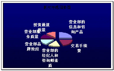。。具筆者調(diào)查,現(xiàn)在對營業(yè)部盈利最大的是機構(gòu)客戶或者大額個人投資者,而隨著股市行情的低彌,他們在選取營業(yè)部的考慮因素主要關(guān)鍵點及其所占比例如下圖: