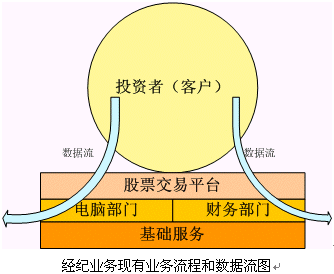 。。從上圖可以看出,現(xiàn)在的證券公司的經(jīng)紀業(yè)務(wù)為各個股民或者說投資者所提供的服務(wù)就是交易平臺的服務(wù),也就是交易通道服務(wù)。營業(yè)部的其他服務(wù)都是為這個交易通道服務(wù),這些服務(wù)品種都是非;A(chǔ)的。而營業(yè)部的數(shù)據(jù)流,也就是各個客戶的基本信息和交易信息,通過電腦部和財務(wù)部門就走到了終結(jié),沒有被更好的利用。