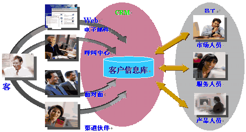 CRM是在90年代,隨著Internet的發(fā)展成熟起來。它充分利用了Internet技術(shù),通過電話中心、網(wǎng)站、電子郵件、移動技術(shù)的使用,提供客戶多種形式的渠道,完成銷售、服務(wù)、市場等多種職能和流程,滿足客戶不同種類、不同層次的需求。這些渠道全方位地收集客戶信息,并通過集中的數(shù)據(jù)庫進行管理和共享。而數(shù)據(jù)挖掘技術(shù)幫助企業(yè)進一步分析客戶需求,提供決策支持。如下圖(資料來源:Siebel公司)。
