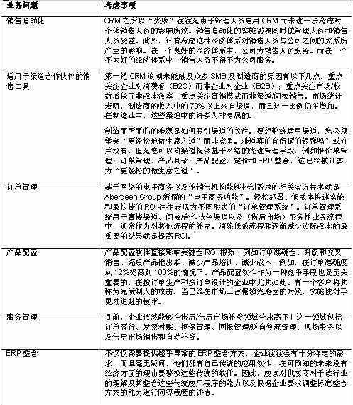 對(duì)于包括生產(chǎn)行業(yè)在內(nèi)的許多垂直行業(yè)而言,CRM 技術(shù)不再是只有 SMB 可以享用的稀有解決方案,現(xiàn)在這些企業(yè)也要求進(jìn)行此類投資,以便與競(jìng)爭(zhēng)對(duì)手一爭(zhēng)高下。許多 SMB 已經(jīng)實(shí)施 CRM 方案,減少銷售與服務(wù)成本,提高銷售效率,并提高客戶滿意度。問題的關(guān)鍵是要慎重選擇解決方案。您選擇的解決方案應(yīng)該為您的企業(yè)增加價(jià)值,從長(zhǎng)遠(yuǎn)來看,您需要一個(gè)能夠提供集成式端到端解決方案的業(yè)務(wù)合作伙伴,而且其解決方案要符合您在預(yù)算和利益方面的要求。