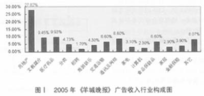 廣告客戶在報(bào)紙投放廣告的目的在于說服讀者成為其產(chǎn)品或服務(wù)的消費(fèi)者,他們最感興趣的是向那些最有可能成為其消費(fèi)者的讀者做廣告,而“報(bào)紙讀者與廣告目標(biāo)受眾的相關(guān)性決定了廣告信息是否能夠到達(dá)廣告客戶所希望的人群”。為此,廣告客戶更愿意在其目標(biāo)消費(fèi)群接觸率高的報(bào)紙上投放廣告。由于《羊城晚報(bào)》的讀者群具有學(xué)歷較高、職業(yè)較穩(wěn)定、收入較高、消費(fèi)能力較強(qiáng)等特點(diǎn),因此成為房地產(chǎn)、汽車、電訊、家具等耐用消費(fèi)品行業(yè)塑造品牌的平臺(tái)。另外,《羊城晚報(bào)》的讀者以家庭訂戶為主,他們對健康、教育、休閑、娛樂比較關(guān)注,因此醫(yī)藥、文化教育、食品保健品、旅游等廣告在羊城晚報(bào)也占有較大比例(見圖Ⅰ,統(tǒng)計(jì)期間為2005年1月-10月)。
