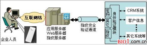 基于生物識(shí)別技術(shù)的CRM指紋身份認(rèn)證系統(tǒng)應(yīng)用模式如下: