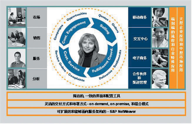 mySAP CRM不僅包含了企業(yè)市場(chǎng)營(yíng)銷、銷售、服務(wù)、分析等功能,還通過渠道伙伴、現(xiàn)場(chǎng)和移動(dòng)商務(wù)、交互中心、電子商務(wù)等各種交互渠道形成完整的閉環(huán)式設(shè)計(jì)的解決方案。在提供深入的行業(yè)應(yīng)用和傳統(tǒng)的部署方式的同時(shí),mySAP