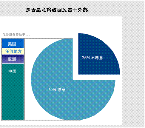 在所有被調(diào)查者中,明確表示不愿意將數(shù)據(jù)放置于托管服務(wù)器比例相對較低,只有25%的被調(diào)查者認(rèn)為他們不愿意將公司數(shù)據(jù)放置于外部托管服務(wù)器。