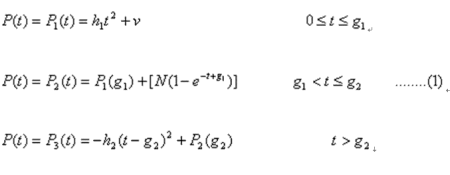 式中,P(t)為客戶第t個時間單元的客戶利潤。P1(t)為一二次增函數(shù),表示客戶利潤以一定的加速度(2h1)快速增加;P2(t)為一上漸近線函數(shù),表示客戶利潤一直增長但增長越來越慢,且始終越不過一個利潤最高限,最高限為(P1(g1)+N);P3(t)為一個二次降函數(shù),表示客戶利潤以一定的加速度(2h2)銳減。參數(shù)v、h1、h2、g1、g2、N都是正常數(shù)。v是客戶第一次購買帶給公司的利潤,通常這個值不高,甚至接近0(不考慮獲取成本,否則v常為負(fù)值)。h1、h2反映了客戶利潤增長和下降的加速度。g1、g2是利潤曲線發(fā)生轉(zhuǎn)折的兩個時點。N是g1時點后利潤總增幅的極限。
