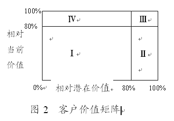 (二)確定客戶當(dāng)前相對價值和客戶相對潛在價值通過預(yù)測,識別出了客戶當(dāng)前價值CCV和增值潛力CPV。但是,這兩個維度指標(biāo),均以絕對價值形式出現(xiàn)對客戶進(jìn)行細(xì)分并不理想(張國方,金國棟,2003(3)),在一定程度上會影響到理論應(yīng)用的方便性(簡便性)。因此,可以采用更加明了和更具有實踐操作性的維度指標(biāo)——客戶當(dāng)前相對價值和客戶相對潛在價值。“客戶的相對當(dāng)前價值”是指某一客戶提供的當(dāng)前價值與企業(yè)未來可望實現(xiàn)的當(dāng)前價值總額的比值;而“客戶的相對潛在價值”是某一客戶提供的增值價值與企業(yè)未來可望實現(xiàn)的全部最大增值價值的比值。
