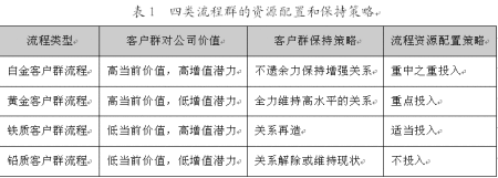 流程由活動、活動的邏輯順序、活動的實現(xiàn)方式、活動的承擔(dān)者四個基本要素組成。通過活動的整合來產(chǎn)生“流程多面手”或活動講廢除來減少成本,利用信息技術(shù)將“串聯(lián)”活動變成“并聯(lián)”活動來改變活動斬邏輯順序以提高流程效率,或者改變活動承擔(dān)者的數(shù)量或素質(zhì),這些都將導(dǎo)致流程群資源分配的變動。例如,銀行的業(yè)務(wù)流程設(shè)置:低價值客戶以電子設(shè)備的自助服務(wù)為主;中價值客戶以柜面服務(wù)為主;高價值客戶以大戶室一對一服務(wù)為主;設(shè)置專業(yè)化的理財中心,由客戶經(jīng)理全程代為辦理各項業(yè)務(wù),同時由高素質(zhì)的理財專家根據(jù)客戶的風(fēng)險收益偏好提供高質(zhì)量的理財產(chǎn)品等。可見,不同客戶其流程的資源配置差異較大。依據(jù)客戶群——流程矩陣,下表描述了四類流程群所對應(yīng)的四類客戶群的四種資源配置方式。