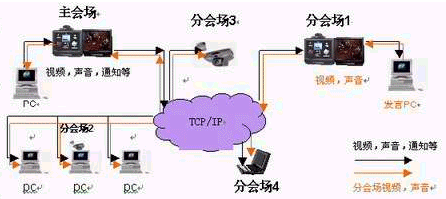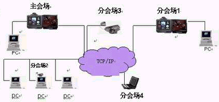 可視化Ip電話會(huì)議系統(tǒng): 是利用計(jì)算機(jī),多媒體通信技術(shù)和設(shè)備,通過傳輸信道在兩地或多個(gè)地點(diǎn)之間開會(huì)的一種通信手段。在召開會(huì)議時(shí),處于兩地或不同地點(diǎn)的與會(huì)代表,既可以聽到對(duì)方的聲音,又可以看到對(duì)方的形象,同時(shí)還能看到對(duì)方會(huì)議室的場(chǎng)景,以及在會(huì)議中展示的事物、圖片、表格、文件等,縮短了與會(huì)代表的距離,使大家好像在同一會(huì)議室參加會(huì)議一樣。它的廣泛應(yīng)用必然產(chǎn)生巨大的社會(huì)效益和經(jīng)濟(jì)效益。系統(tǒng)結(jié)構(gòu)簡圖如下: