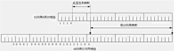 D類地址的最后28比特沒有結(jié)構(gòu)化,即沒有網(wǎng)絡(luò)ID和主機(jī)ID之分。響應(yīng)某一個(gè)IP多播地址的主機(jī)構(gòu)成一個(gè)主機(jī)組,主機(jī)組可跨越多個(gè)網(wǎng)絡(luò)。主機(jī)組的成員數(shù)是動(dòng)態(tài)的,主機(jī)可以通過IGMP協(xié)議加入或離開某個(gè)主機(jī)組。IP多播地址影射到以太網(wǎng)地址的方法見下圖。因?yàn)镮P多播地址的高5位未影射,因此,影射的以太網(wǎng)地址不是唯一的,共有32個(gè)IP多播地址影射到一個(gè)以太網(wǎng)地址。