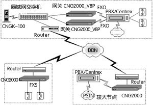 根據(jù)實(shí)際的話務(wù)量和人員數(shù)量,選用FXO接口2-8路語(yǔ)音的CNG2000 IP語(yǔ)音網(wǎng)關(guān)1臺(tái)。可以選用PBX應(yīng)用方式或向電信公司申請(qǐng)Centrex業(yè)務(wù)。