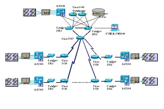 VoIP網(wǎng)關AS5300問世以來就可以支持兩個VoIP的中繼端口,在業(yè)界屬較高密度,而且99年年中就支持4個E1VoIP中繼端口。更主要的是AS5300具有Voice/Fax功能卡,能自動識別Voice和Fax,與Voice和Fax要采用不通的功能卡的產(chǎn)品相比,等于容量更是提高。這些技術特點為該試驗網(wǎng)工程的可擴展性提供了較高的起點。