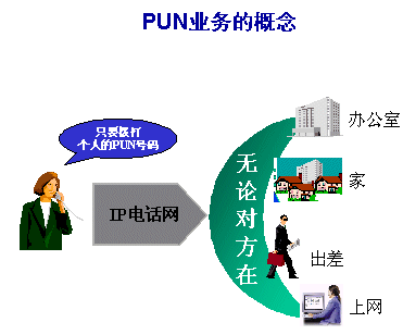 PUN業(yè)務(wù)首先給注冊用戶分配一個(gè)號碼,此號碼根據(jù)運(yùn)營商所申請到的網(wǎng)號及用戶規(guī)模來規(guī)劃,如181XXXXXXX,申請到該號碼后,用戶可以通過各種方便的方式(如上網(wǎng)、打電話)等將此號碼綁定到任一特定終端,如家庭電話,移動(dòng)手機(jī)等,綁定以后,任何人在任何地點(diǎn)都可以通過拔打此號碼,PUN系統(tǒng)將會(huì)根據(jù)用戶的設(shè)置,將此呼叫經(jīng)IP網(wǎng)絡(luò)送至對應(yīng)的終端,從而完成呼叫,PUN用戶還可以設(shè)置繁雜的規(guī)劃,如當(dāng)手機(jī)關(guān)機(jī)時(shí),將呼叫送至某一固定電話,或在用戶上網(wǎng)時(shí),首選PC機(jī)作為呼叫終端,也可以根據(jù)時(shí)間段來靈活設(shè)置終端,其設(shè)置方法也比傳統(tǒng)的呼叫轉(zhuǎn)移更加方便和靈活。其圖一: