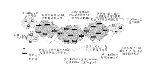 區(qū)分服務(wù)是由綜合服務(wù)(Int-serv )發(fā)展而來的,它采用了IETF的基于RSVP的服務(wù)分類標(biāo)準(zhǔn),拋棄了分組流沿路節(jié)點上的資源預(yù)留。區(qū)分服務(wù)將會有效地取代跨越大范圍的RSVP的使用。區(qū)分服務(wù)區(qū)域的主要成員有:核心路由器、邊緣路由器、資源控制器(BB,Bandwidth Broker)。在區(qū)分服務(wù)中,網(wǎng)絡(luò)的邊緣設(shè)備對每個分組進(jìn)行分類、標(biāo)記DS域,用DS域來攜帶IP分組對服務(wù)的需求信息。在網(wǎng)絡(luò)的核心節(jié)點上,路由器根據(jù)分組頭上的DS碼點(Code Point)選擇碼點所對應(yīng)的轉(zhuǎn)發(fā)處理。資源控制器BB配置了管理規(guī)則,為客戶分配資源,它可以通過服務(wù)級別協(xié)定SLA (Service Level Agreement)與客戶進(jìn)行相互協(xié)調(diào)以分享規(guī)定的帶寬。