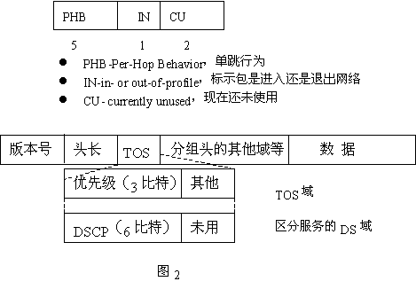 QoS的業(yè)務(wù)區(qū)分結(jié)構(gòu)使用IPV4報頭中的業(yè)務(wù)類型(TOS)字段,并將8位TOS字段重新命名,作為DS字段,其中6位可供目前使用,其余2位以備將來使用。該字段可以按照預(yù)先確定好的規(guī)則加以定義,使下行節(jié)點通過識別這個字段,獲取足夠的信息來處理到達(dá)輸入端口的數(shù)據(jù)包并將他們正確地轉(zhuǎn)發(fā)給下一跳的路由器。這里需要注意的是在IPV4網(wǎng)中所定義的TOS字段與在Diff-Serv中的DS字段不同。TOS字段的定義如圖2所示。圖IPV4報頭中TOS字段定義Diff-Serv充分考慮了IP網(wǎng)絡(luò)本身靈活,可擴展性強的特點,將復(fù)雜的服務(wù)質(zhì)量保證通過DS字段轉(zhuǎn)換為先進(jìn)的單跳行為,從而大大減少了信令的工作。