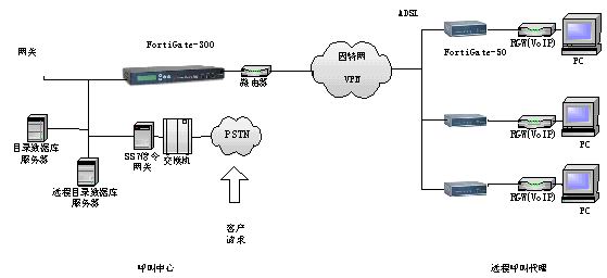 -300在總部,F(xiàn)ortiGate-50在遠程代理,為呼叫中心總部和遠程通信辦公室提供了可升級的解決方案,保證了良好的網(wǎng)絡傳輸性能,具有良好的擴展能力,