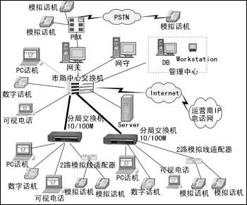 首信的IP-PBX解決方案如圖所示。以某局為例,市局與各分局之間已有寬帶網(wǎng),充分利用此帶寬以數(shù)字電話形式開展語音業(yè)務(wù)。數(shù)字電話的實(shí)現(xiàn)形式有:PC話機(jī)、數(shù)字話機(jī)、可視電話、通過模擬線適配器接入的模擬話機(jī),數(shù)字電話設(shè)備直接通過Hub與以太網(wǎng)交換機(jī)相連。數(shù)字電話通過IP電話網(wǎng)關(guān)與市局中心的程控交換機(jī)PBX相連,從而與現(xiàn)有的模擬話機(jī)相通。各種數(shù)字話機(jī)與內(nèi)部模擬話機(jī)間通話,都不需要付電話費(fèi),通過PBX撥打局外面的市話或長途電話時(shí),與原來的模擬電話一樣付費(fèi)。