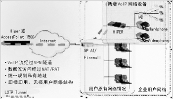 眾所周知,得到了廣泛的商用VoIP協(xié)議之一H.323功能強(qiáng)大,能根據(jù)網(wǎng)絡(luò)的狀況協(xié)商VoIP網(wǎng)關(guān)參數(shù)。但是,H.323協(xié)議的編碼的復(fù)雜性和端口的不確定性使得絕大部分NAT/PAT設(shè)備不能處理H.323。然而,基于HiPER的L2TP的VPN解決方案,不僅使話音在一個安全的網(wǎng)絡(luò)中運(yùn)行,還可以解決由于H.323協(xié)議復(fù)雜性帶來的NAT/PAT問題,在不用改造用戶現(xiàn)有的數(shù)據(jù)網(wǎng)絡(luò)的前提下,引進(jìn)了可以實際使用的VoIP服務(wù),保護(hù)了用戶的投資。
