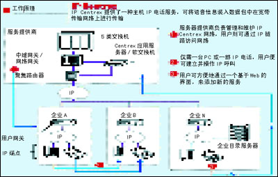 IP Centrex包含了大量能向企業(yè)提供語(yǔ)音業(yè)務(wù)的IP電話(huà)服務(wù),他可將呼叫裝入數(shù)據(jù)包中在寬帶傳輸網(wǎng)絡(luò)上傳送,而一個(gè)寬帶傳輸網(wǎng)絡(luò)可被用來(lái)承載多個(gè)呼叫的語(yǔ)音數(shù)據(jù)。在工作時(shí),如果某個(gè)呼叫還沒(méi)有激活,那么將會(huì)有更多的帶寬分配到高速數(shù)據(jù)會(huì)話(huà)中(high-speed