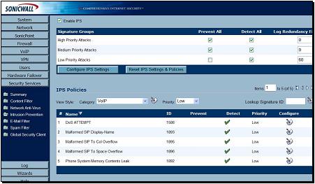 SonicWALL入侵檢測服務(wù)(IPS)能夠?yàn)閂oIP協(xié)議應(yīng)用層提供全面保護(hù)。IPS集成了一個(gè)可配置的超高性能掃描引擎,配合動(dòng)態(tài)更新和擁有1900多攻擊和漏洞簽名的數(shù)據(jù)庫,可以保護(hù)網(wǎng)絡(luò)免受最復(fù)雜的木馬和變形威脅的影響。SonicWALL已經(jīng)利用一系列VoIP相關(guān)的簽名來擴(kuò)展其IPS簽名數(shù)據(jù)包,可以防止惡意業(yè)務(wù)流到達(dá)受保護(hù)的VoIP電話和服務(wù)器。