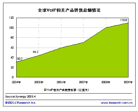 艾瑞市場咨詢(iResearch)根據(jù)Synergy的數(shù)據(jù)整理顯示,隨著VoIP市場的開發(fā),企業(yè)用戶對VoIP的接受度增加,在2004年VoIP相關(guān)產(chǎn)品的銷售總額達到了30.7億美元,預(yù)計在2005年可達到44.2億美元,2009年將突破110億美元。艾瑞市場咨詢(iresearch)