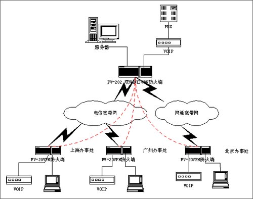 VPN防火墻網(wǎng)關(guān)具有雙WAN口和QOS帶寬管理功能,總部同時接入兩條ADSL線路,通過策略路由,把內(nèi)部網(wǎng)絡(luò)的上網(wǎng)訪問全部從WAN2的ADSL上網(wǎng),而把VOIP和VPN全部通過WAN1的ADSL來傳輸,從而避免了上網(wǎng)的請求占用VPN和VOIP的帶寬。同時,通過對內(nèi)部網(wǎng)絡(luò)不同的業(yè)務(wù)劃分不同的優(yōu)先級,特別是把VOIP的優(yōu)先級做為最高,優(yōu)先轉(zhuǎn)發(fā)VOIP的數(shù)據(jù)包,同時又通過VOIP和VPN傳輸分配最大和最小的保證帶寬,來保護(hù)VOIP業(yè)務(wù)的正常通信。除此之外,F(xiàn)V-202強(qiáng)大的訪問控制功能,特別是對VPN隧道的訪問控制功能,可以對各地的分公司通過VPN訪問總公司的服務(wù)器進(jìn)行控制,為不同的客戶分配不同的權(quán)限,讓遠(yuǎn)程的VPN隧道只能訪問指定的IP地址或相關(guān)的業(yè)務(wù)端口,能很好保證VPN的訪問安全。特別值得一提的是,F(xiàn)V-202支持網(wǎng)通、電信雙線路接入,如果由于北方網(wǎng)通跨網(wǎng)接入,可以在全部申請網(wǎng)通線路,把北方的分支機(jī)構(gòu)接入到總部的網(wǎng)通線路,可以避免由于跨網(wǎng)帶來的帶寬瓶頸。在各個分支機(jī)構(gòu)配置iRouter的FV-20VPN防火墻,為各個分支機(jī)構(gòu)構(gòu)建一道安全的防線,實現(xiàn)與總部的VPN的聯(lián)接。同時,外出的員工或領(lǐng)導(dǎo)通過IPSEC的撥號軟件,實現(xiàn)移動的接入,通過VPN,東莞奧愛斯構(gòu)建全國的融合的安全通信平臺,既可以解決VOIP的被竊聽的風(fēng)險,又能實現(xiàn)實時的數(shù)據(jù)訪問。從而大大地降低公司長途的話費和以往租用數(shù)據(jù)專線的高昂的費用,提高了公司的工作效率,為公司帶來十分明顯的經(jīng)濟(jì)效益。