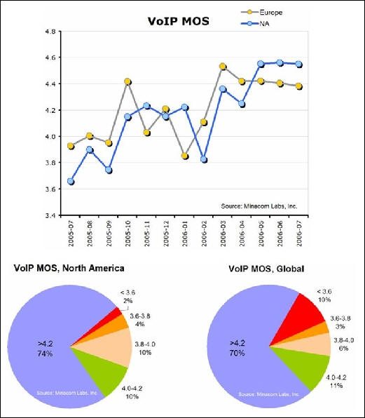 Minacom最新調(diào)研表明,一年來VoIP電話質(zhì)量和聯(lián)結(jié)速度都超過傳統(tǒng)標(biāo)準(zhǔn)公共開關(guān)電話。電話質(zhì)量得分Mean Opinion Score (MOS)數(shù)據(jù)表明,VoIP得分是4.2,而標(biāo)準(zhǔn)公共開關(guān)電話得分3.9。85%的IP電話質(zhì)量和穩(wěn)定性都超過標(biāo)準(zhǔn)公共開關(guān)電話。對電話聯(lián)結(jié)速度,VoIP的MOS得分是平均8.2秒,傳統(tǒng)電話時間更長,平均為8.9秒。這里的IP電話服務(wù)指商業(yè)企業(yè)級應(yīng)用,不是MSN,雅虎通之類免費IP電話個人應(yīng)用。比較而言,北美IP電話質(zhì)量優(yōu)于歐洲。