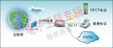 VoIP(通過(guò)IP協(xié)議的音頻服務(wù))電話,同時(shí)能夠進(jìn)行Skype Out呼叫,降低話費(fèi)。Skype DECT電話系統(tǒng)的基礎(chǔ)設(shè)施如圖3所示。