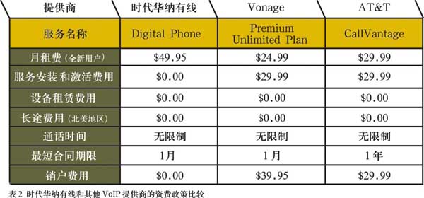 聲稱其1/3的有線電視用戶和一半以上的寬帶用戶訂購(gòu)了其提供的VoIP服務(wù)。對(duì)于時(shí)代華納有線的全新VoIP用戶來(lái)說(shuō),開(kāi)通并使用“數(shù)字電話”的費(fèi)用為每月49.95美元,那些時(shí)代華納有線的寬帶用戶只需44.95美元,如果用戶同時(shí)使用有線電視和寬帶,那么只需要39.95美元就可以了,時(shí)代華納有線為所有的服務(wù)(視頻、語(yǔ)音和數(shù)據(jù)接入)提供每月統(tǒng)一的賬單。此外用戶使用“數(shù)字電話”不需要簽訂長(zhǎng)期合同,并享有30天的試用期,相對(duì)于其競(jìng)爭(zhēng)對(duì)手來(lái)說(shuō)賦予了用戶更多的自由。